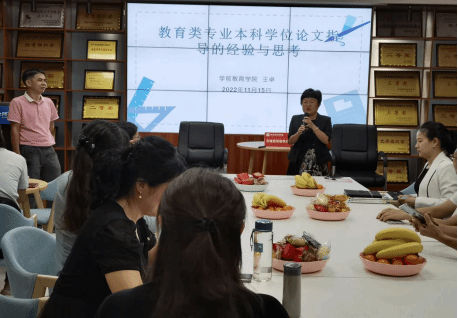 为全面落实立德树人根本任务,以加强师生学术交流和提高师生综合素养为依托,以推动教师专业化发展和提高学校人才培养质量为宗旨,推广先进教学经验和教学成果。我校于2022年11月15日下午举办了“衍道教育教学活动沙龙”第五期活动,本次活动主题为“教育类专业本科学位论文指导经验与思考”,由学前教育学院罗丽丹副院长主持,邀请了学前教育学院王卓副教授担任主讲人,各学院领导、教师共计20余人参加了本次沙龙活动。