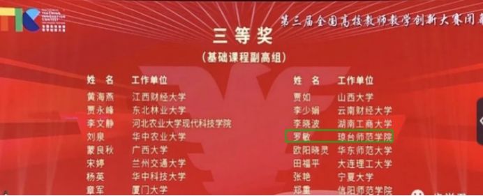近日,第三届全国高校教师教学创新大赛获奖教师名单正式公布,经过激烈角逐,我校文学院罗敏老师团队获得基础课程组三等奖,实现我校教师教学创新大赛国赛奖项零的突破。该项赛事由教育部高等教育司指导,中国高等教育学会主办,目前已经成功举办三届,是国家全力推动高等教育“质量革命”的重要举措。