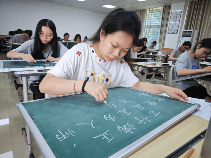 为夯实师范生从教基本功,强化职业技能培养,5月24日,我校在桂林洋校区和府城校区组织开展全校师范生“三字一画”教师基本功考核。本次考核由教务处统筹实施,参加学生共计7483人次,围绕钢笔字、粉笔字、毛笔字及简笔画四项基本技能展开全面检验。